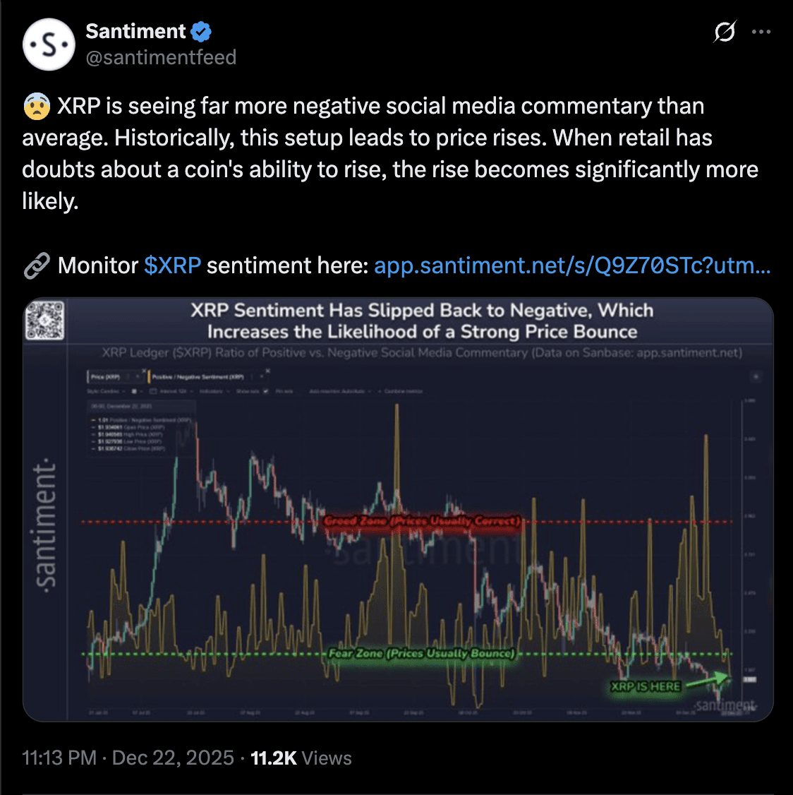 I dati di mercato mostrano un'estrema negatività del sentimento che domina le discussioni relative a XRP. Secondo Santiment, le metriche indicano chiacchiere sociali ribassiste a livelli visti l'ultima volta a novembre di quest'anno, un periodo che ha preceduto un forte rimbalzo.