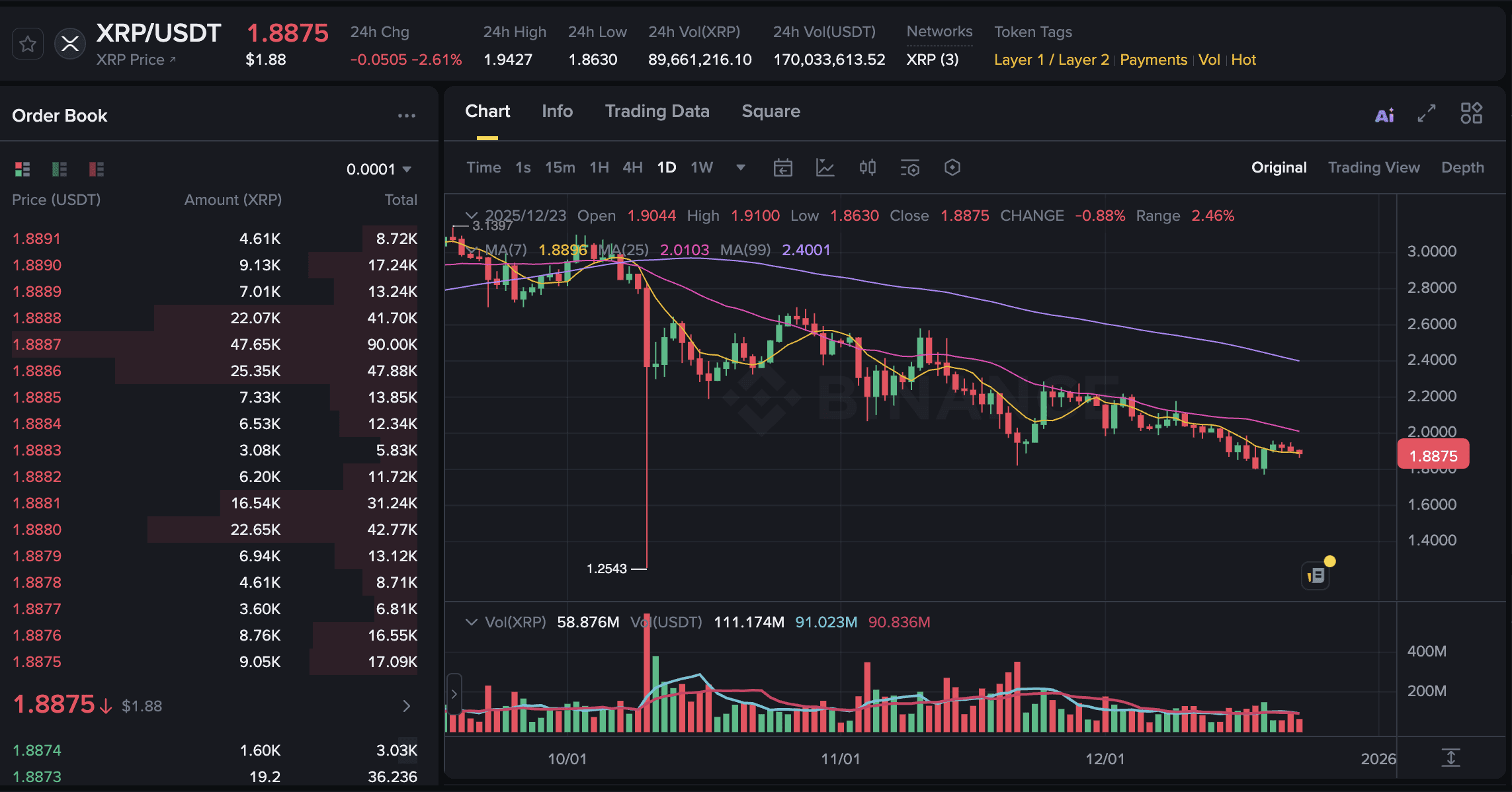 XRP è sceso del 2,4% nelle ultime 24 ore, sottoperformando il mercato delle criptovalute più ampio con un -2,6%. Il token è sceso sotto l'area chiave di $1.90, accelerando il momentum al ribasso durante una liquidità festiva ridotta.