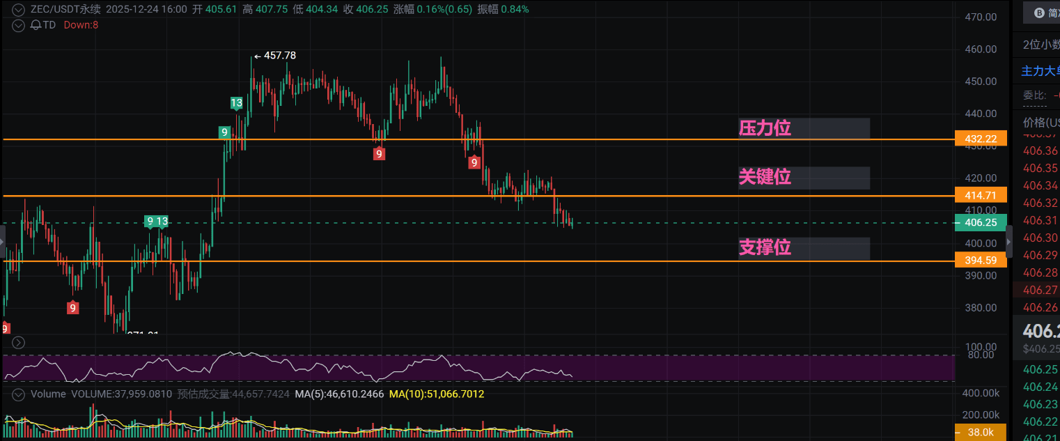 悬念伏笔:但真正的考验在432压力位!若突破,ZEC将开启“主升浪”;若受阻,则可能回踩414二次确认支撑——城主将在明日早盘8点发布“432突破战”的实时策略,关注城主,不错过任何暴富机会!