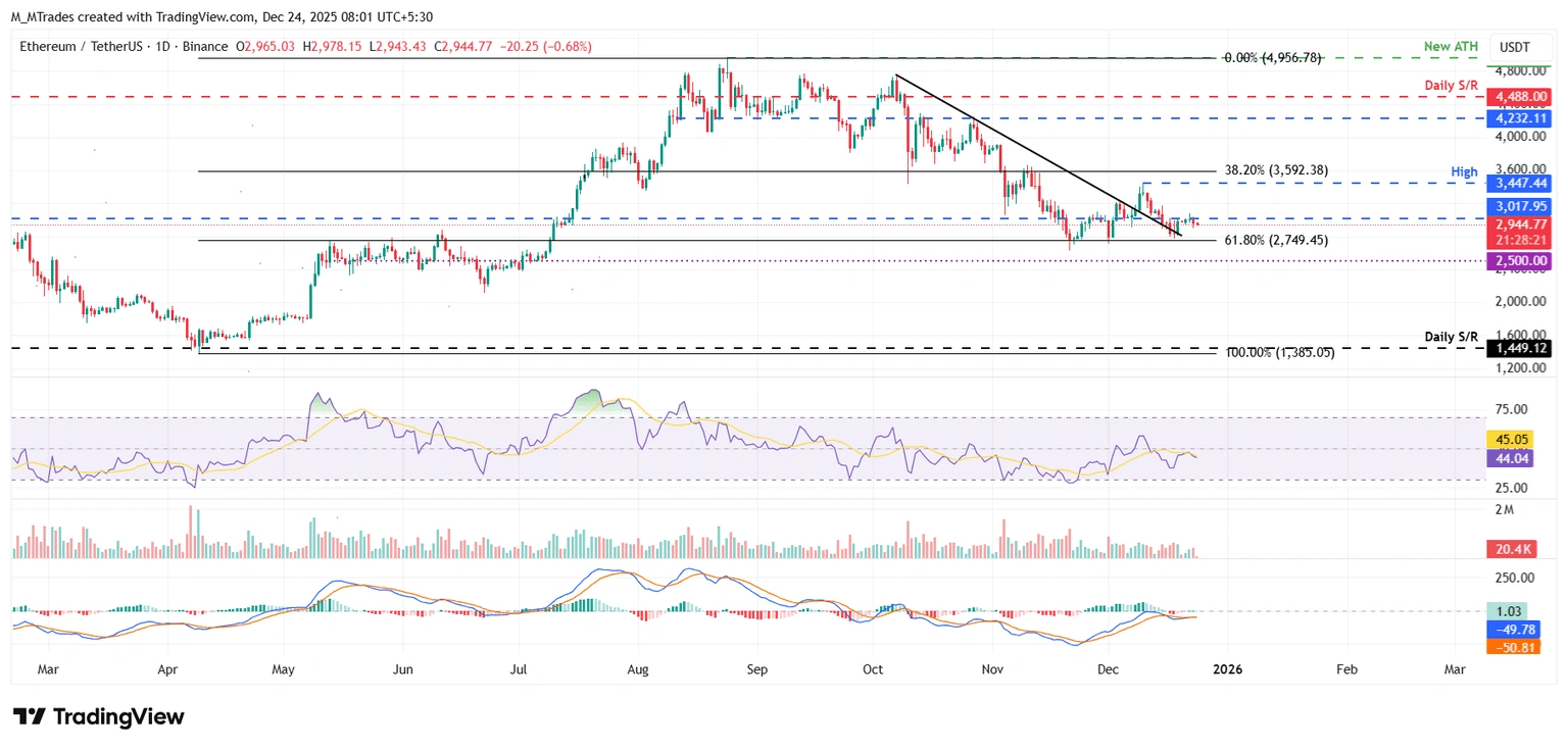 Il prezzo di Ethereum è stato respinto dal livello di resistenza giornaliero a $3,017 lunedì e ha subito una flessione dell'1,48% il giorno successivo. A mercoledì, ETH è scambiato a $2,944.