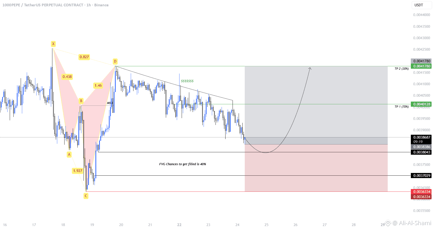 حاليًا، أكمل PEPE نمط الفراشة ثم كسر الهيكل، والذي تم تحديده كـ BOS على المخطط. السيولة تتواجد فوق خط الاتجاه، والسعر حاليًا يكمل تصحيحه. هناك فرصة صغيرة لـ FVG، والذي تم تحديده أيضًا على المخطط.⚠️ تنويه: