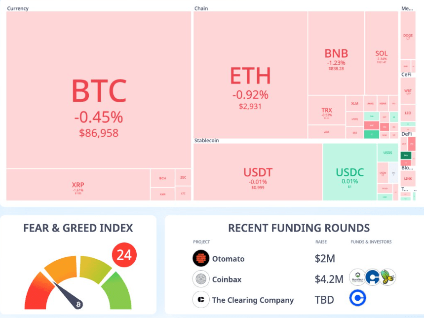 BTC: 86.961 dollari (-0,5%), ETH: 2.932 dollari (-1%)