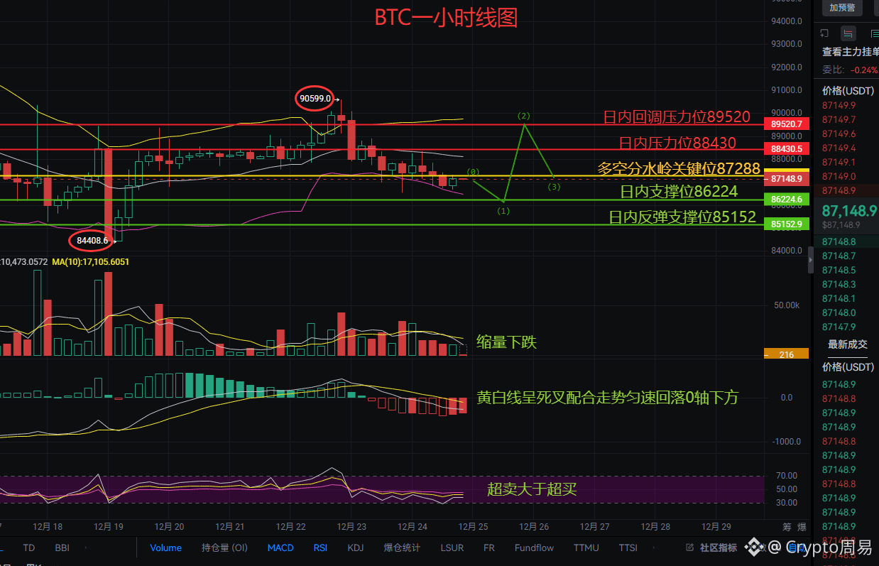 目前BTC被压在88430下方,连摸都摸不到。上方的89520更是像一座大山。而下面的支撑呢?