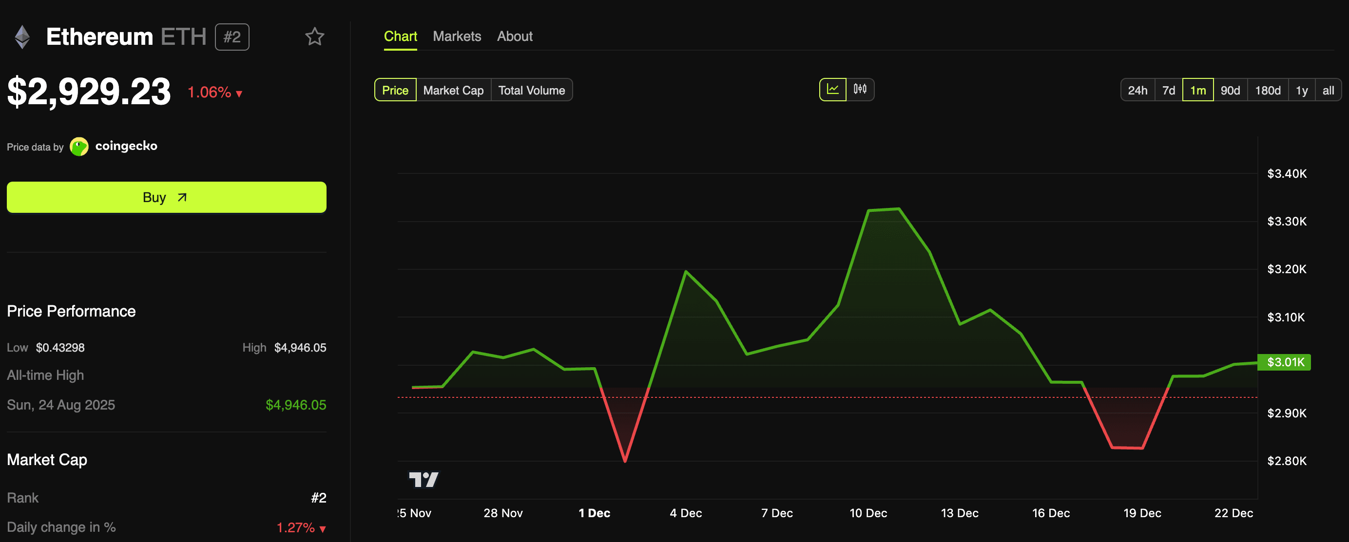 I dati di BeInCrypto Markets hanno mostrato che Ethereum ha continuato a lottare in mezzo a un più ampio calo del mercato. Al momento della scrittura, ETH era scambiato a $2,929.23, in calo dell'1.06% nelle ultime 24 ore.