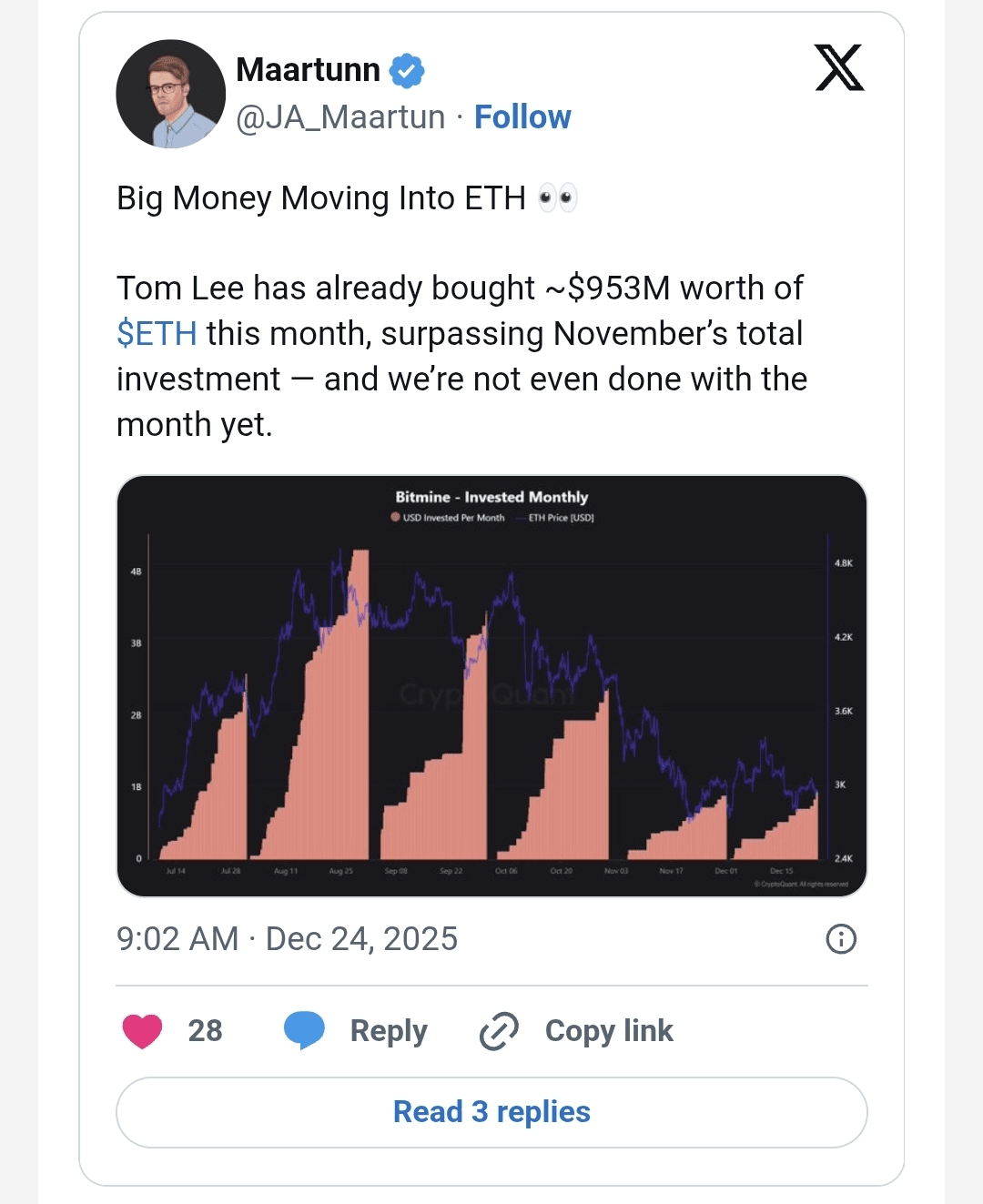 “Hanno iniziato a pescare dal fondo ETH all'inizio di novembre a circa 3.400 dollari. Fino ad ora, hanno accumulato un totale di 580.000 ETH (circa 1,72 miliardi di dollari), con un costo medio stimato di circa 3.208 dollari. Ciò significa che attualmente si trovano su una perdita non realizzata di circa 141 milioni di dollari,” ha riportato EmberCN.