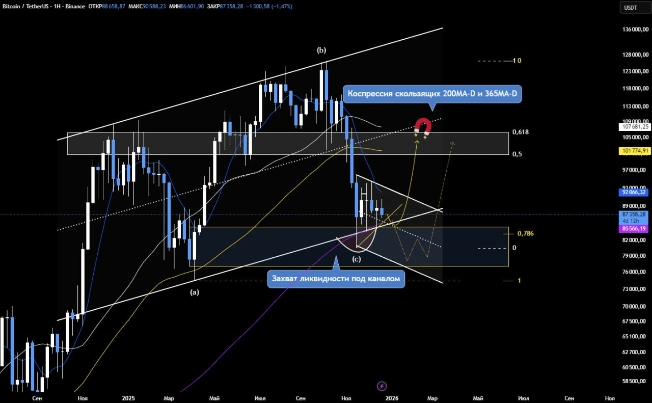 A questo si aggiungono le incertezze delle attuali formazioni [triangoli simmetrici], quindi l'uscita in una delle direzioni potrebbe determinare il prossimo movimento del mercato. Comunque vada, ci deve essere un rimbalzo. O sarà attraverso un nuovo minimo, o da $83k o addirittura dai livelli attuali. Ma in ogni caso, le prospettive per il 2026 non sono molto positive [non ci sarà un nuovo massimo, dato che siamo fondamentalmente in un mercato ribassista].