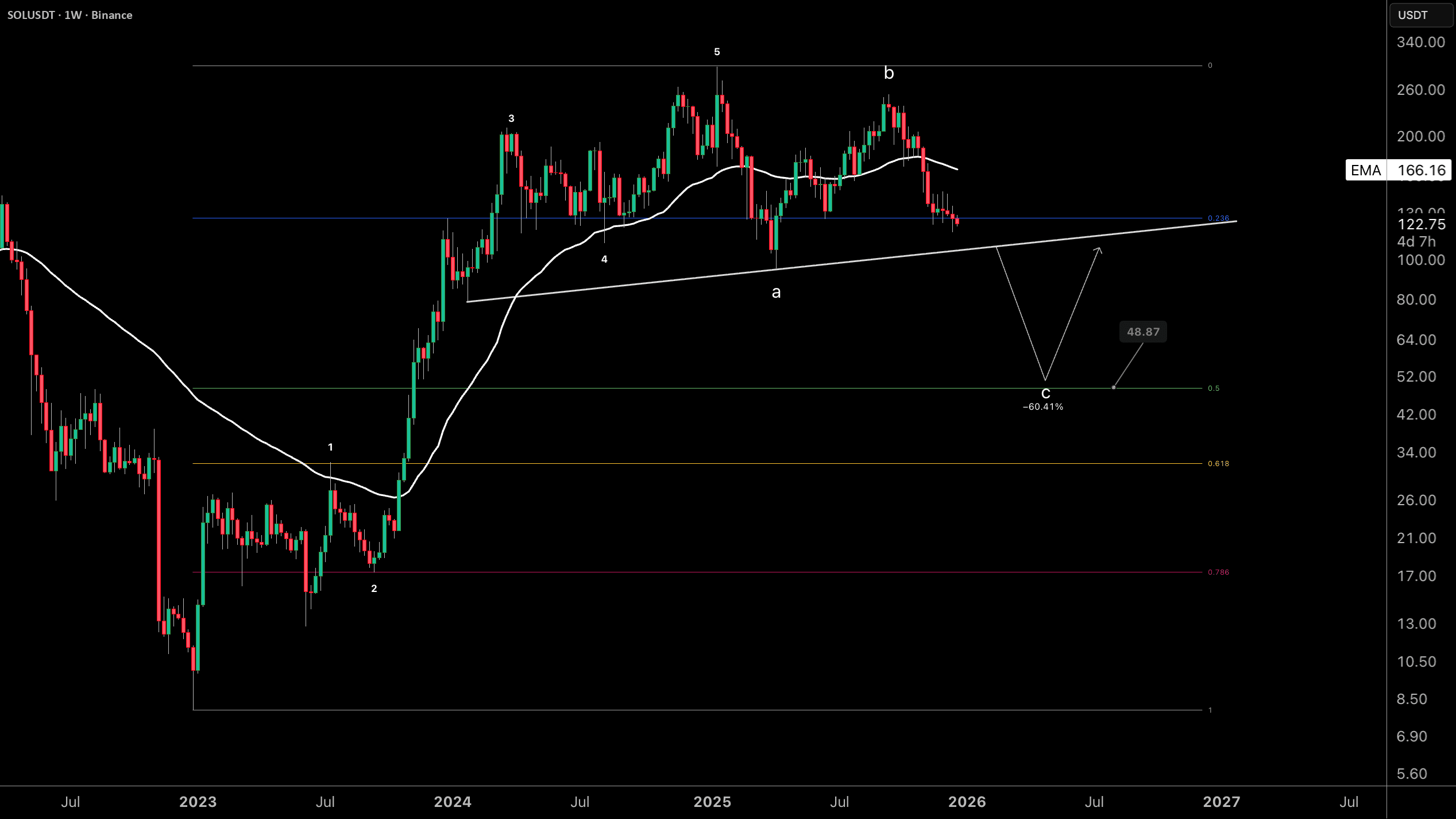 Questo grafico mostra SOLUSDT sul timeframe settimanale, che viene utilizzato per valutare la struttura del trend a lungo termine piuttosto che la volatilità a breve termine. Dopo un forte rally impulsivo dai minimi del 2023, Solana ha completato un chiaro avanzamento a cinque onde, seguito da una transizione in una fase correttiva. Il prezzo ora sta scambiando sotto l'EMA settimanale, un filtro di trend chiave che storicamente separa l'espansione rialzista dai regimi correttivi o ribassisti. La perdita dell'EMA settimanale spesso segnala che il momentum al rialzo si è indebolito e che il mercato sta passando dalla continuazione del trend alla consolidazione o distribuzione.