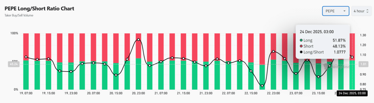 PEPE sta attualmente scambiando a un punto di inversione cruciale, dove le pressioni tecniche si incrociano con l'assorbimento della domanda e l'aumento della leva.