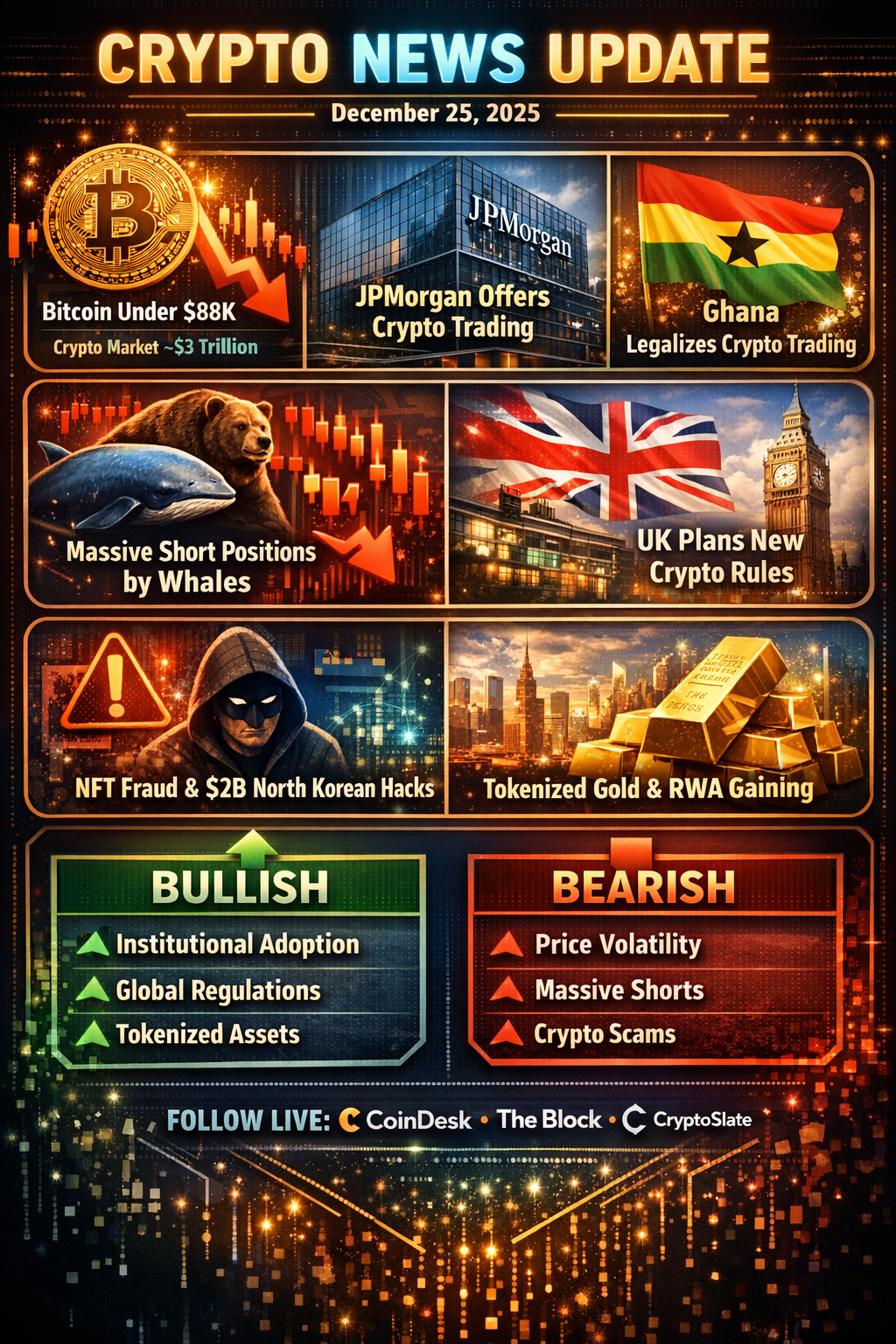 La criptovaluta nel complesso è leggermente in calo mentre l'anno volge al termine; Bitcoin è sceso sotto ~$88K con bassa liquidità nel trading festivo. I mercati sono volatili e limitati con resistenza attorno a ~$90K.