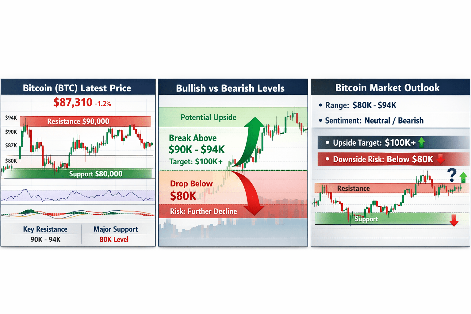 Prezzo: ~ $87,310 (dati di prezzo dal vivo di oggi) che mostrano modesti movimenti nelle 24h.