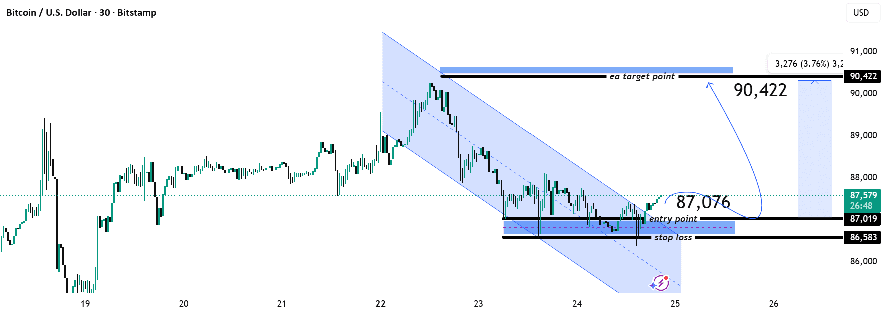 Mossa correttiva bullish prevista se il prezzo rimane sopra 87,000 e conferma con minimi più alti su M30.