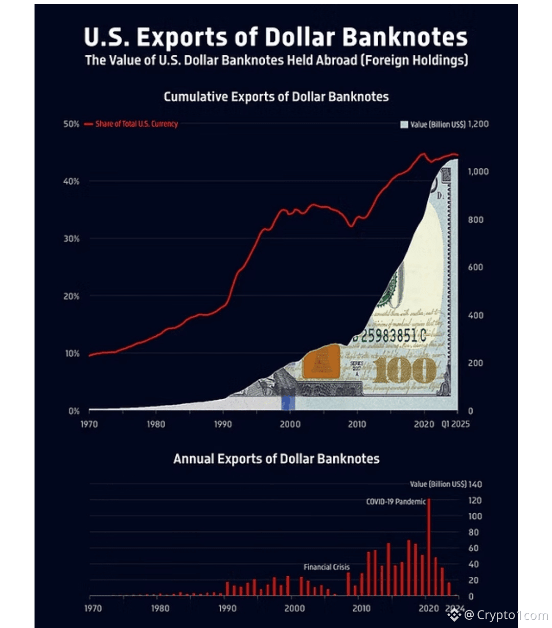 By the first quarter of 2025, the value of U.S. dollar banknotes circulating outside the United States reached $1.05 trillion, accounting for 45% of all U.S. currency in circulation. In other words, nearly half of America’s paper money supply is held abroad. This reflects the unparalleled role of the dollar as a global safe asset, relied upon in regions where local currencies are unstable or where access to international markets requires a trusted medium of exchange.