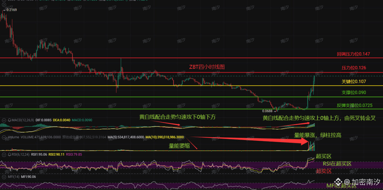 打开ZBT四小时图,几个关键位置像路标一样清晰:压力位0.126,关键位0.107,支撑0.090,更深处的“反弹支撑”在0.0725。