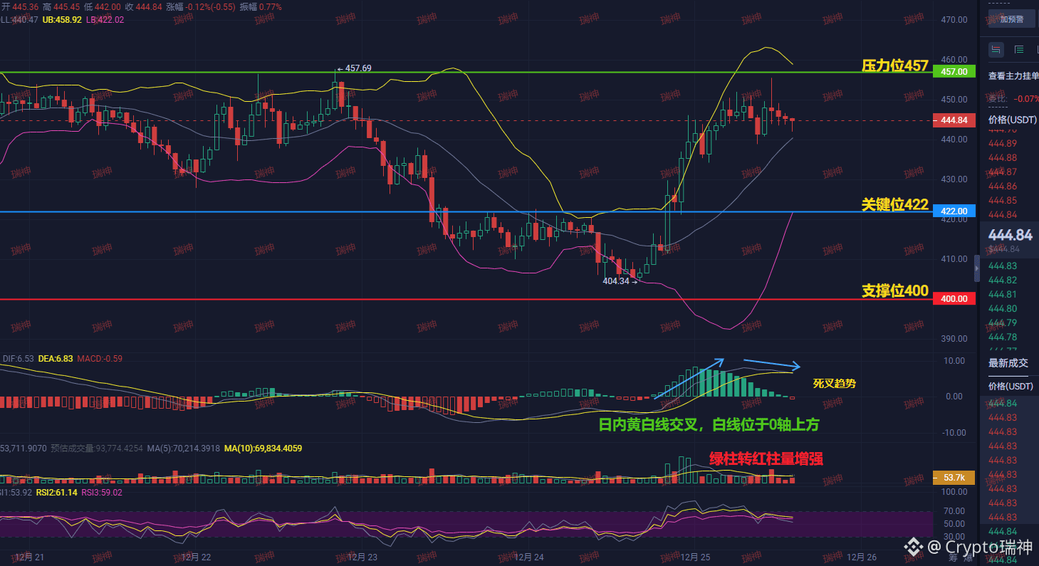 一小时图显示,整体趋势向上,价格在关键位422之上运行。但有个矛盾信号:MACD在0轴上方死叉,且绿柱转红柱,这说明上涨动能在短期内衰减,有回调压力。上方457是强压力位,直接突破需要更大的成交量配合。下方422是关键分水岭,400是强支撑。