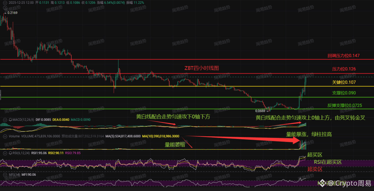 兄弟们注意了!ZBT这波走势不简单,四小时线已经爆出天量,MACD金叉刚刚形成,RSI直接冲到95,这已经不是普通反弹了——这是主力要搞大事的节奏!