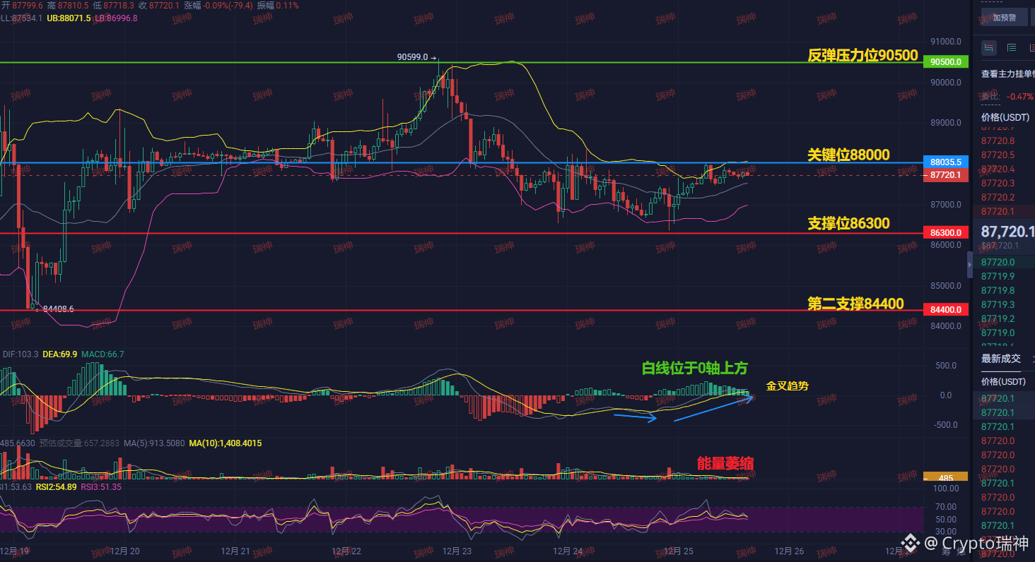 瑞神维持短期看空观点。放量突破88000关键位并冲向90500的可能性极低。更大的概率是,在88000下方继续承压,并最终向下测试86300的支撑,甚至进一步滑向84400。