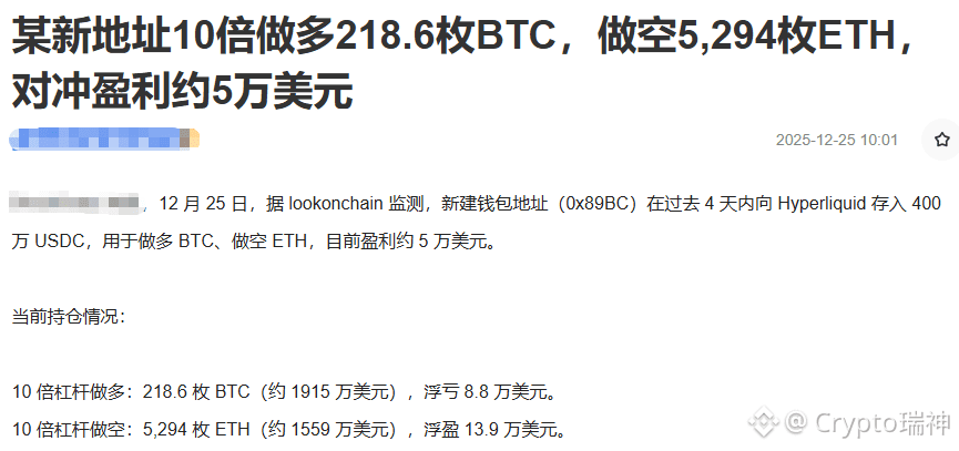 币友们,瑞神上线!今天是圣诞节,市场看着风平浪静,但水底下有大鱼在翻腾。一条消息很值得玩味:有新建地址拿出400万美金,同时10倍杠杆做多$BTC ,又大额做空$ETH 。这可不是普通散户玩得起的,这是典型的机构级“对冲套利”策略。说明聪明钱认为,BTC即便要涨,过程也会非常曲折,需要靠做空别的资产来“保驾护航”。