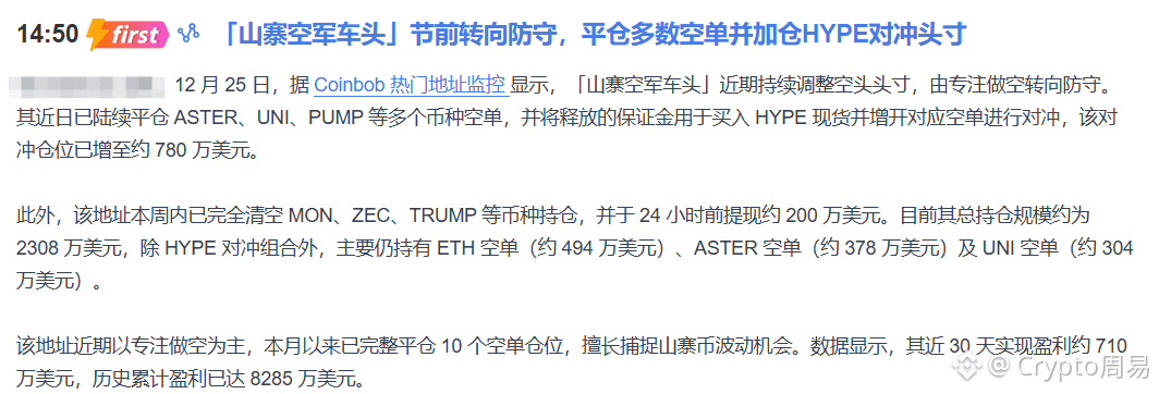 兄弟们注意了!$HYPE 的行情可能要变天了!就在刚才,链上大佬“山寨空军车头”突然调仓——这是什么信号?是看涨还是看跌?别急,周易带你用一张图+一条消息,说清楚HYPE今天到底怎么走!
