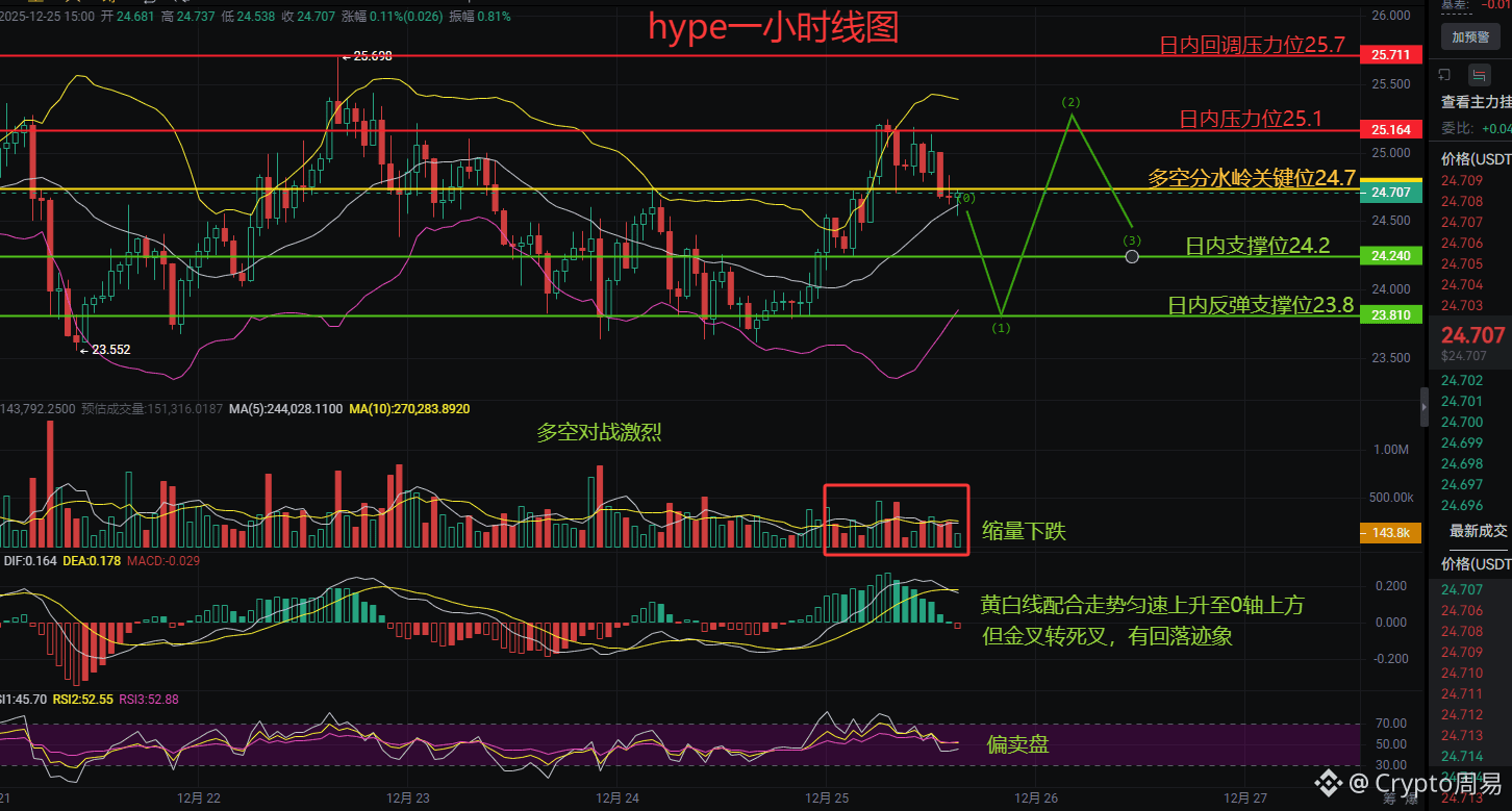 从1小时图看,HYPE整体还在下跌趋势里。上方压力重重,25.7和25.1都是硬骨头,尤其是25.1这个“回调压力位”,冲不过去就容易掉头向下。
