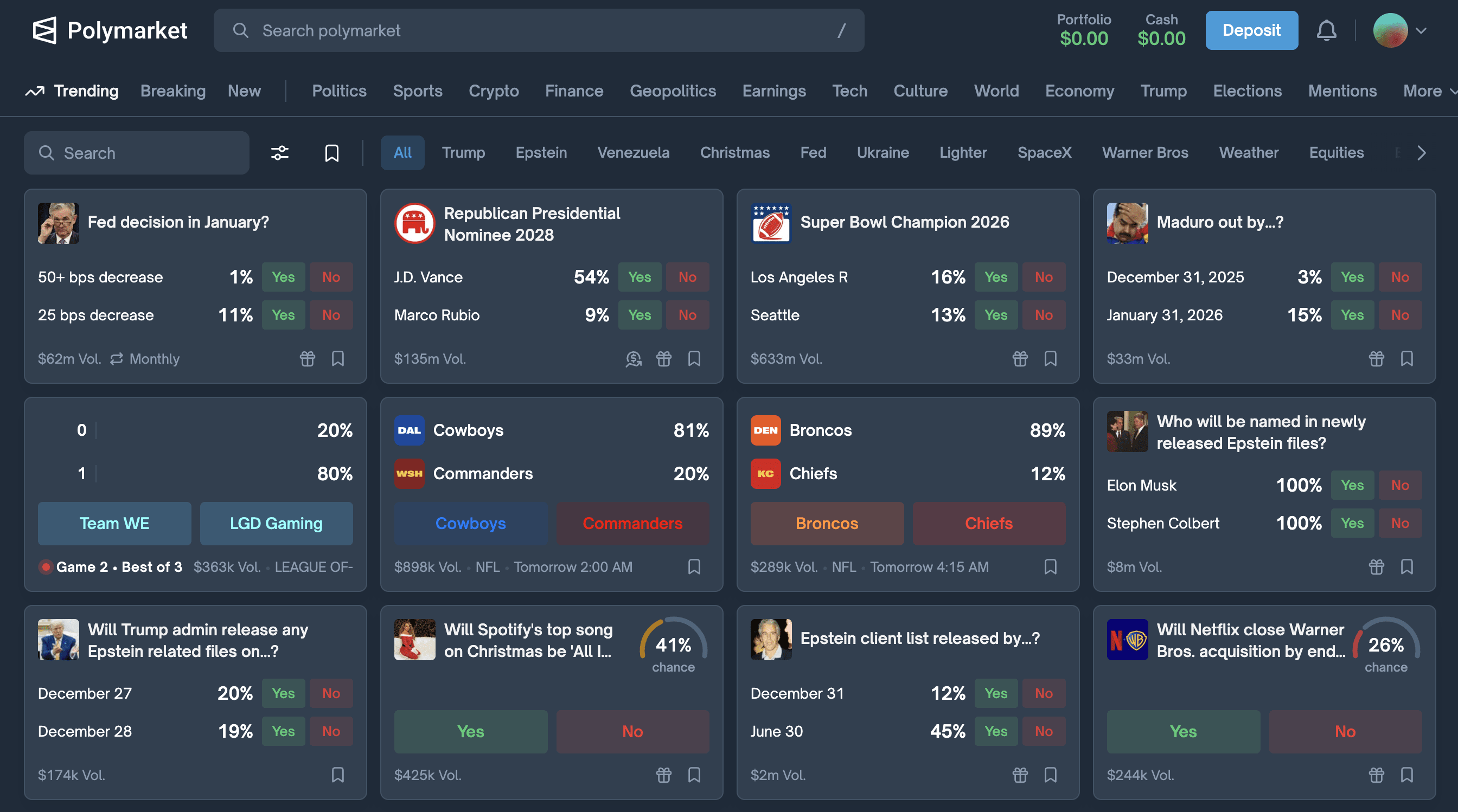 Polymarket è un mercato decentralizzato delle previsioni che opera da molti anni, con una grande base di utenti a livello globale e una vasta copertura di eventi, con mercati corrispondenti a eventi politici, macroeconomici, mercati finanziari, criptovalute, sportivi e sociali.