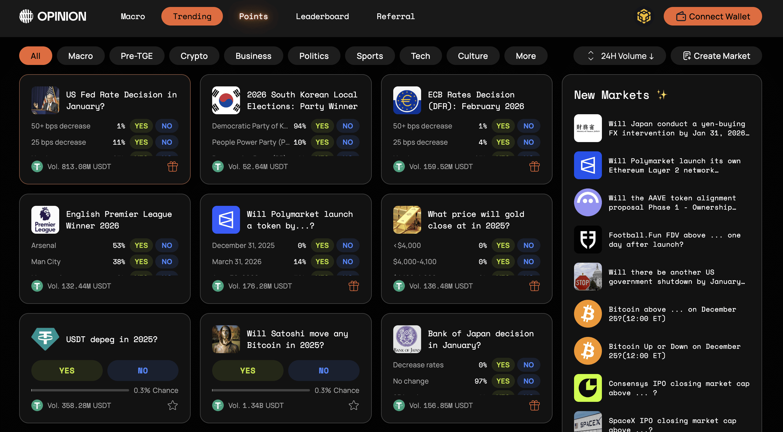 Dal punto di vista della presentazione front-end e della forma delle domande, presenta alcune somiglianze con Polymarket; nella struttura sottostante, Opinion adotta un modello di libro ordini (CLOB), con acquirenti e venditori che abbinano le transazioni attraverso ordini, e la profondità dei diversi mercati varia in base al numero di partecipanti e alla frequenza delle transazioni.