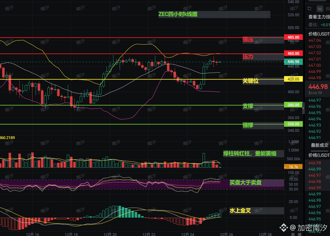 我明确强调:ZEC短期反弹至460附近是关键的“逃命”或“做空”时机,绝非追涨信号。散户务必遵循“压力位看空、支撑位博反弹”原则。具体操作:460-485区间上攻乏力时布局空单;若跌至420以下可轻仓抢反弹,快进快出。整体趋势仍看跌,中期目标指向350,盲目跟风做多风险极高。