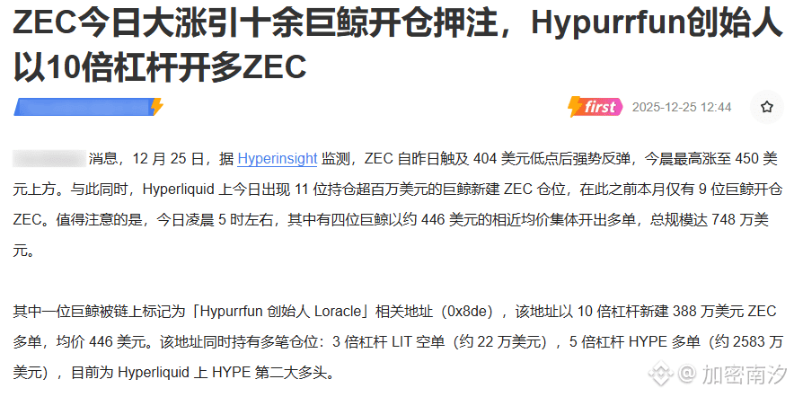 举个真实例子:去年LUNA暴跌前,也有巨鲸高杠杆抄底,结果爆得渣都不剩。今天这位Hypurrfun创始人用10倍杠杆押多,看似豪气,实则险棋——一旦ZEC跌破420,连环爆仓会像多米诺骨牌一样砸盘。市场永远不缺“勇敢者”,缺的是活下来的人。 你想做哪一种?