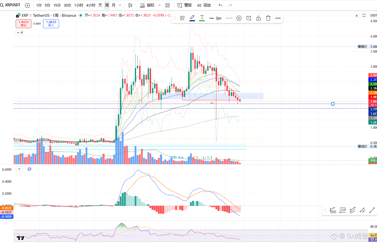 $XRP (现价≈1.82):当前价接近 25 年 4 月最低价 1.6134,上周最低 1.7711,同样差 10% 就到起涨支撑;