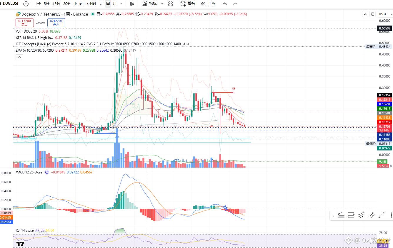 $DOGE (现价≈0.127):24 年 10 月起涨点是 0.10931,24 年 10 月行情的起点,后续涨幅的基础支撑。上周跌至 0.11993,距离关键支撑仅差约 10%。