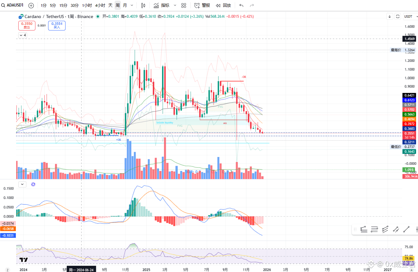 $ADA (现价≈0.35):上周最低砸到 0.3466,距离 24 年 11 月起涨点 0.3201 仅差 10% 左右,周线支撑位近在眼前;