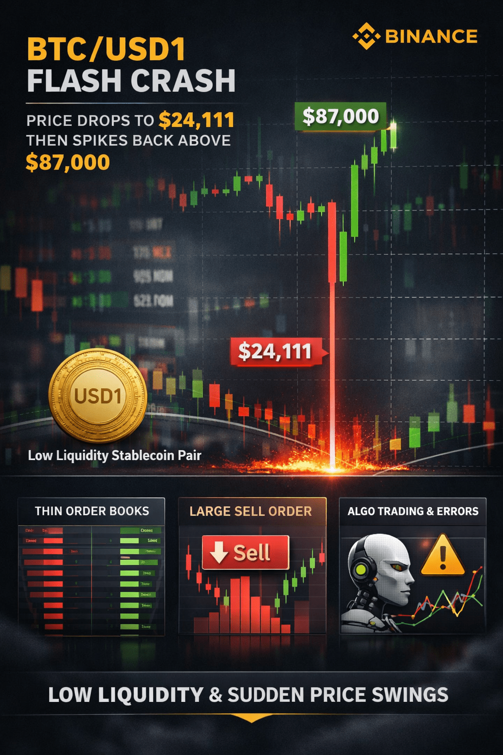 $BTC Bitcoin ha brevemente sperimentato una forte dislocazione del prezzo sul trading pair di Binance$BTC /$USD1 mercoledì sera, stampando momentaneamente vicino a $24,111 prima di rimbalzare rapidamente sopra $87,000. Il movimento è stato isolato al pair USD1 e non è stato osservato in altri principali mercati BTC.