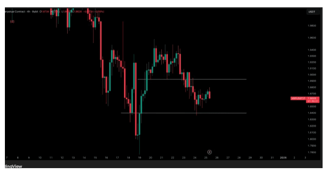 ✨ Il grafico mostra una fase di consolidamento dopo un forte calo all'inizio di questo mese, con molteplici tentativi falliti di costruire un reale slancio verso l'alto. Quella zona di $1.90 ha funzionato come un muro dove il prezzo continua a fermarsi, mentre la linea di $1.84 sottostante ha catturato i precedenti ribassi. Le candele recenti mostrano XRP che cerca di salire ma è ancora intrappolato in un intervallo ristretto senza molta convinzione in nessuna direzione.