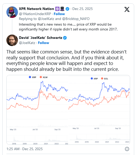 Ha sottolineato che la storia dei prezzi di XRP non può essere spiegata esclusivamente dai rilasci di offerta, in particolare quando tali rilasci sono trasparenti, limitati e ampiamente attesi dal mercato.