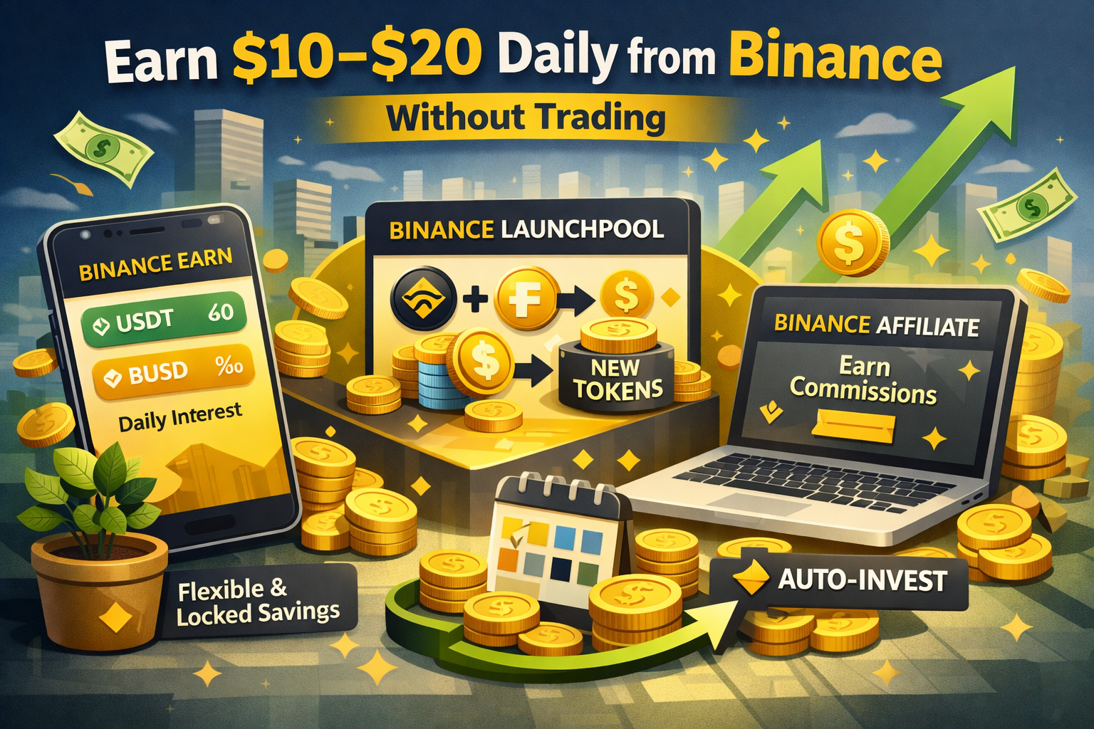 Puoi guadagnare $10 a $20 al giorno su Binance senza fare trading attivamente utilizzando i suoi strumenti integrati di reddito passivo. Una delle opzioni più sicure è Binance Earn (Simple Earn). Depositando stablecoin come USDT o BUSD, puoi iscriverti a risparmi flessibili o bloccati e guadagnare interessi automaticamente ogni giorno.