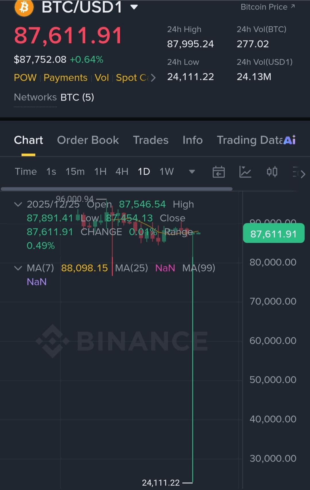 Bitcoin è brevemente sceso a $24,111 sul pair BTC/USD1 di Binance prima di rimbalzare rapidamente sopra $87,000.