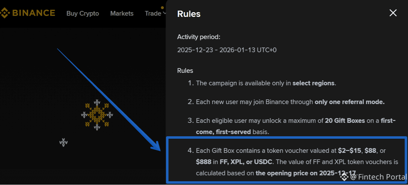 Sblocchi Gift Boxes (scatole misteriose) che contengono ricompense in voucher token (Binance menziona FF, XPL o USDC) e afferma che le ricompense possono valere fino a $888 ciascuna, con un totale di $1M di premi.