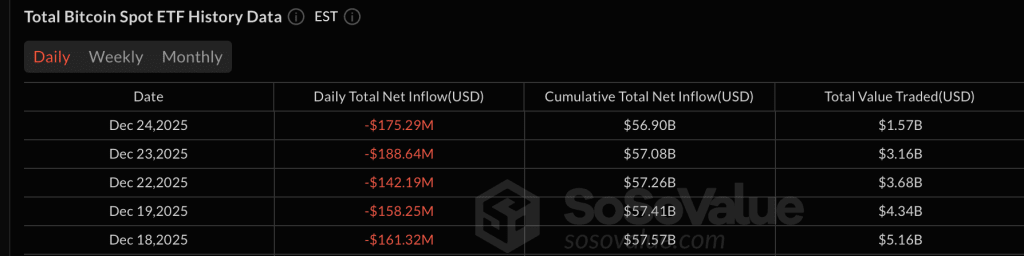 In generale, il trading della vigilia di Natale ha riflesso un tono di mercato cauto. Gli ETF su bitcoin ed ether hanno continuato a vedere deflussi costanti, mentre XRP e solana hanno mantenuto afflussi piccoli ma persistenti, mentre i mercati si preparano per le vacanze.
