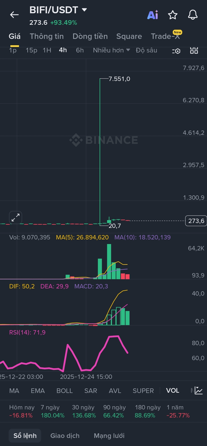 $BIFI è un esempio molto chiaro del rischio di trading su asset con liquidità estremamente bassa. L'apparizione di un “bastone lungo” mai visto — da ~20.7 a ~7,551 — non è una volatilità di mercato normale, ma una rottura completa della struttura dei prezzi a causa della mancanza di liquidità.