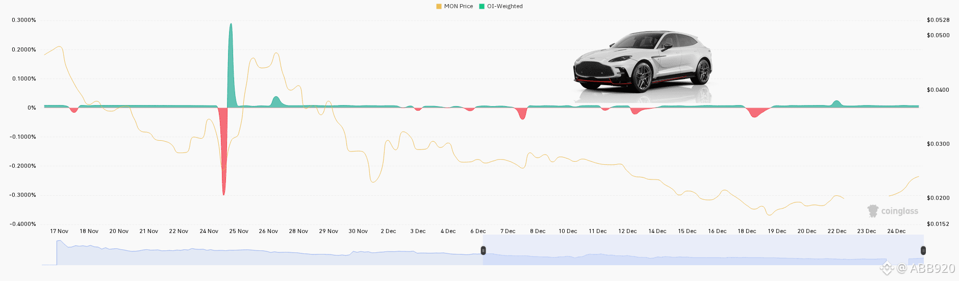 Alright, team, let's talk MON. What a ride, or rather, what a brutal drop this one had! Back on Nov 17, it was cruising around the $0.05 mark, feeling pretty good. Then BAM! Nov 24 hit like a freight train. Price absolutely cratered, diving below $0.0152. You can see that monster red spike in the OI-Weighted indicator right there, confirming everyone was either panic selling or getting liquidated faster than you can say "rekt." Pure carnage.
