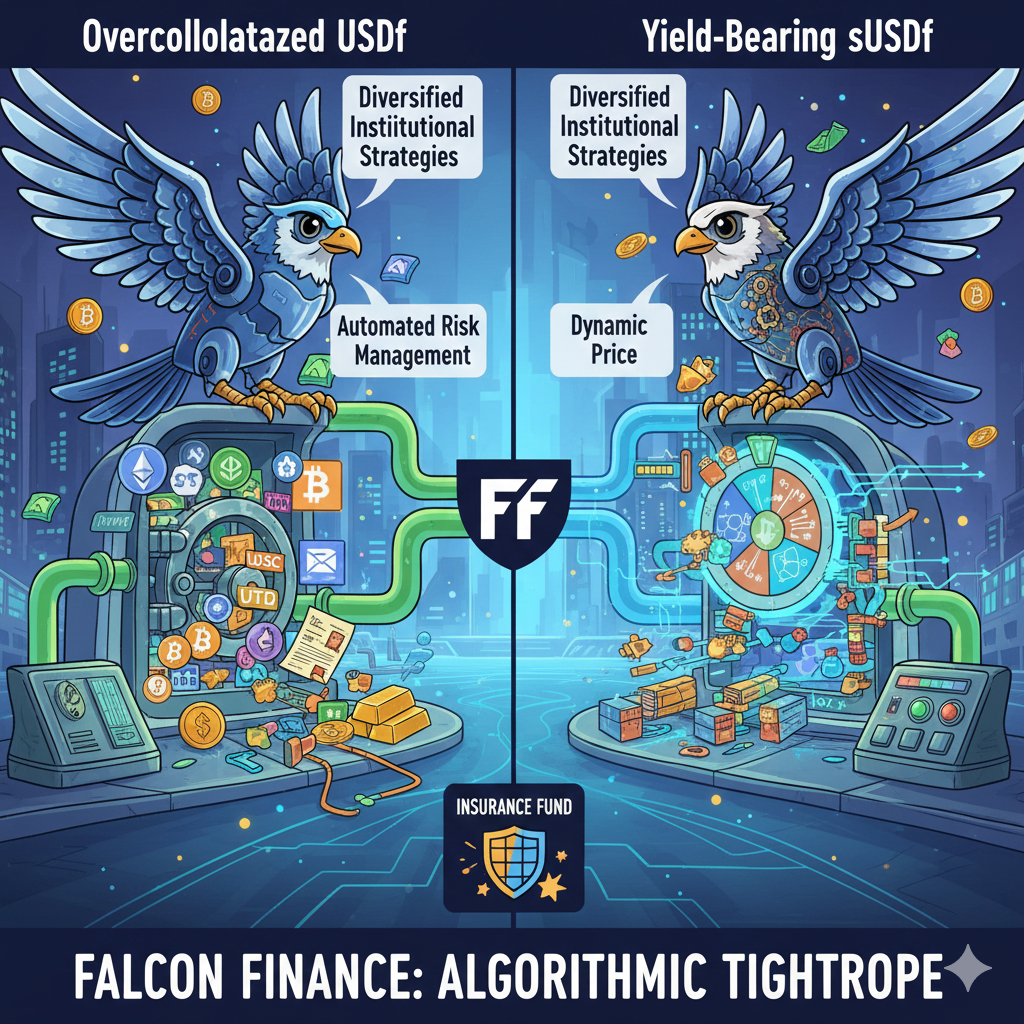Lo spazio del dollaro sintetico è diventato un campo di battaglia dove la precisione matematica incontra il caos del mercato, e Falcon Finance si trova al centro di questa tensione con un protocollo che promette di risolvere il puzzle della generazione di rendimento di DeFi attraverso sofisticazioni algoritmiche. Ciò che emerge dall'analisi del loro approccio non è solo un'altra storia di innovazione DeFi, ma un caso studio sulle sfide fondamentali dell'automazione dei mercati finanziari che rimangono ostinatamente umani nella loro irrazionalità. L'architettura a doppio token di Falcon, che combina USDf sovracollateralizzato con sUSDf a rendimento, rappresenta un tentativo ambizioso di creare rendimenti sostenibili attraverso strategie istituzionali diversificate, eppure incarna anche il classico paradosso di DeFi dove soluzioni eleganti devono sopravvivere al contatto con forze di mercato imprevedibili.