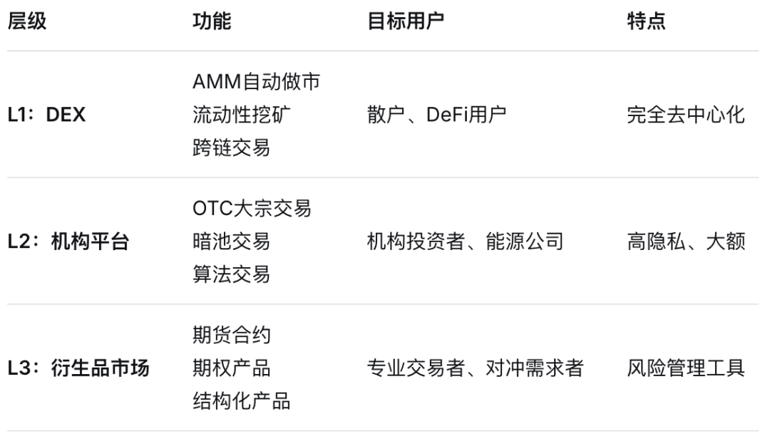 Costruire un percorso evolutivo a tre livelli da digitalizzazione di asset specifici → piattaforma di trading di settore verticale → catena pubblica finanziaria energetica generica, diventando infine il "Nasdaq blockchain + rete di regolamento di base" per gli asset energetici.
