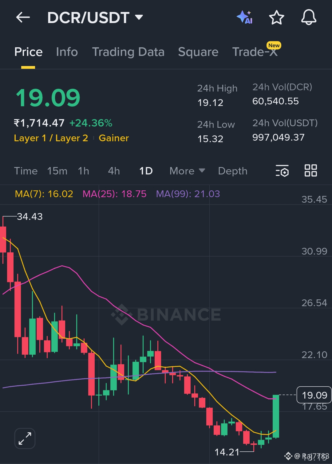 #DCR breaking out! 📈 Up 24.36% to 19.09, leading Layer 1/2 gainers. Strong volume near 1M USDT. Bulls in control.