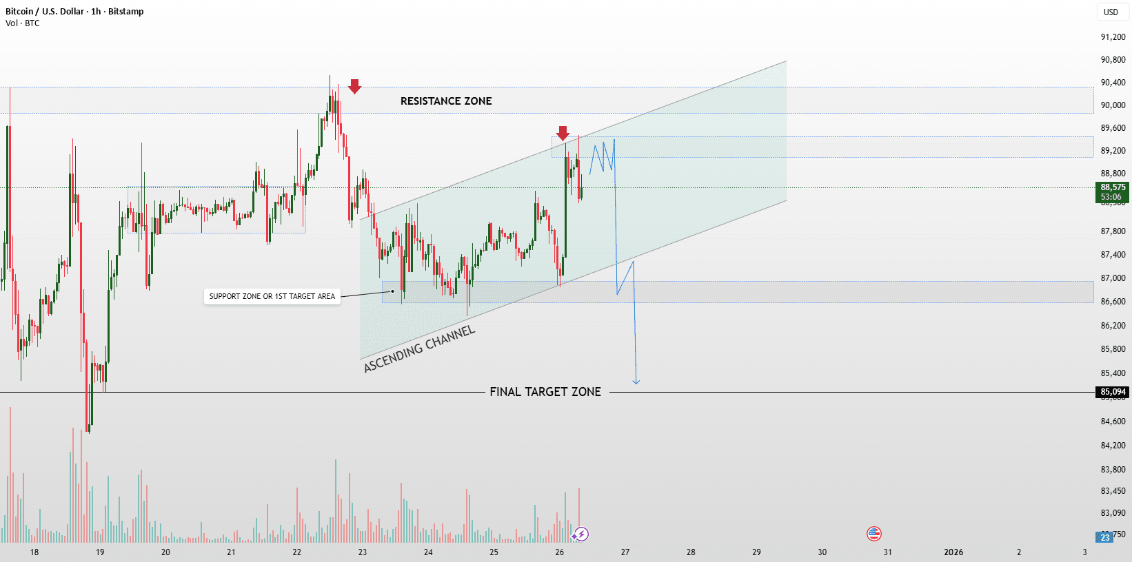 Finché il prezzo rimane sotto resistenza, è probabile un ritracciamento verso il supporto del canale. Una rottura pulita e mantenuta sopra 91k invaliderebbe lo scenario di ritracciamento ribassista e favorirebbe una continuazione verso l'alto.
