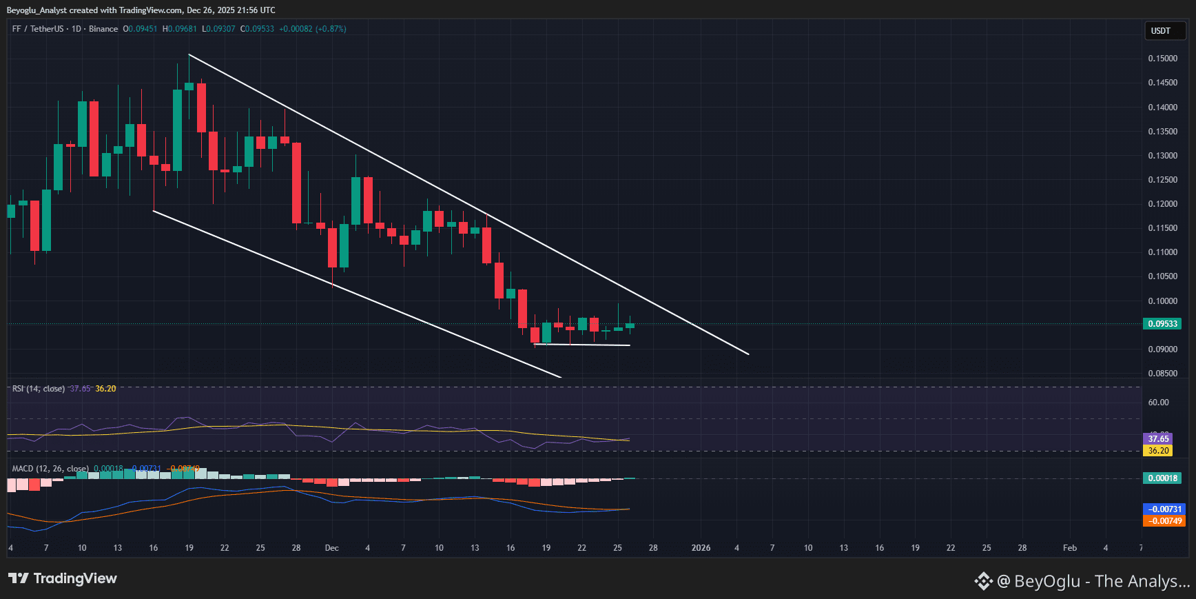 @Falcon Finance is moving inside a falling wedge pattern. $FF has found support near 0.09$ and now forming multiple green candles on daily time frame making slow upward move. Falcon Finance will soon retest the descending resistance trend line. If it will break above this trend line we can expect a short term rally towards 0.12$.