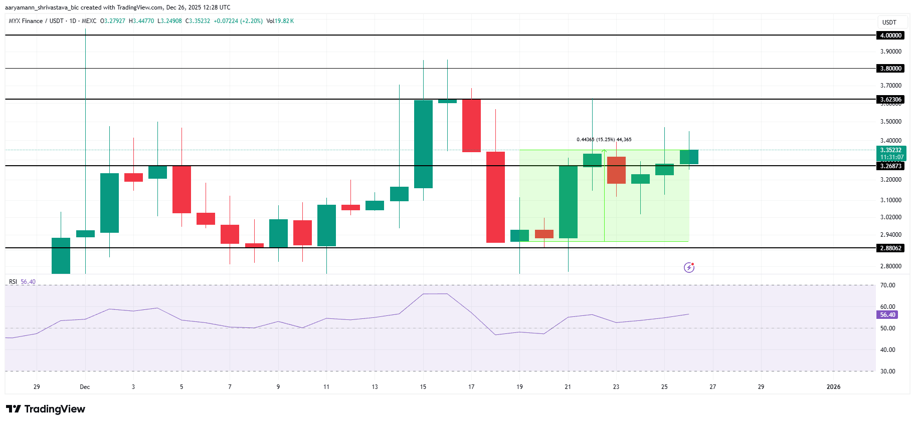 Il prezzo di MYX è stato scambiato intorno a $3.35 al momento della scrittura, dopo essere aumentato del 15.2% negli ultimi sette giorni. L'altcoin continua a mantenersi sopra il supporto di $3.26. La struttura attuale suggerisce che i compratori stanno mirando alla resistenza di $3.62 mentre lo slancio si costruisce gradualmente.