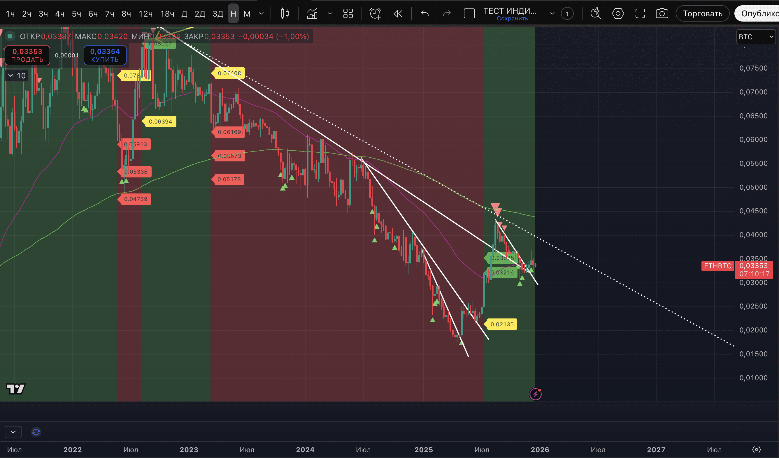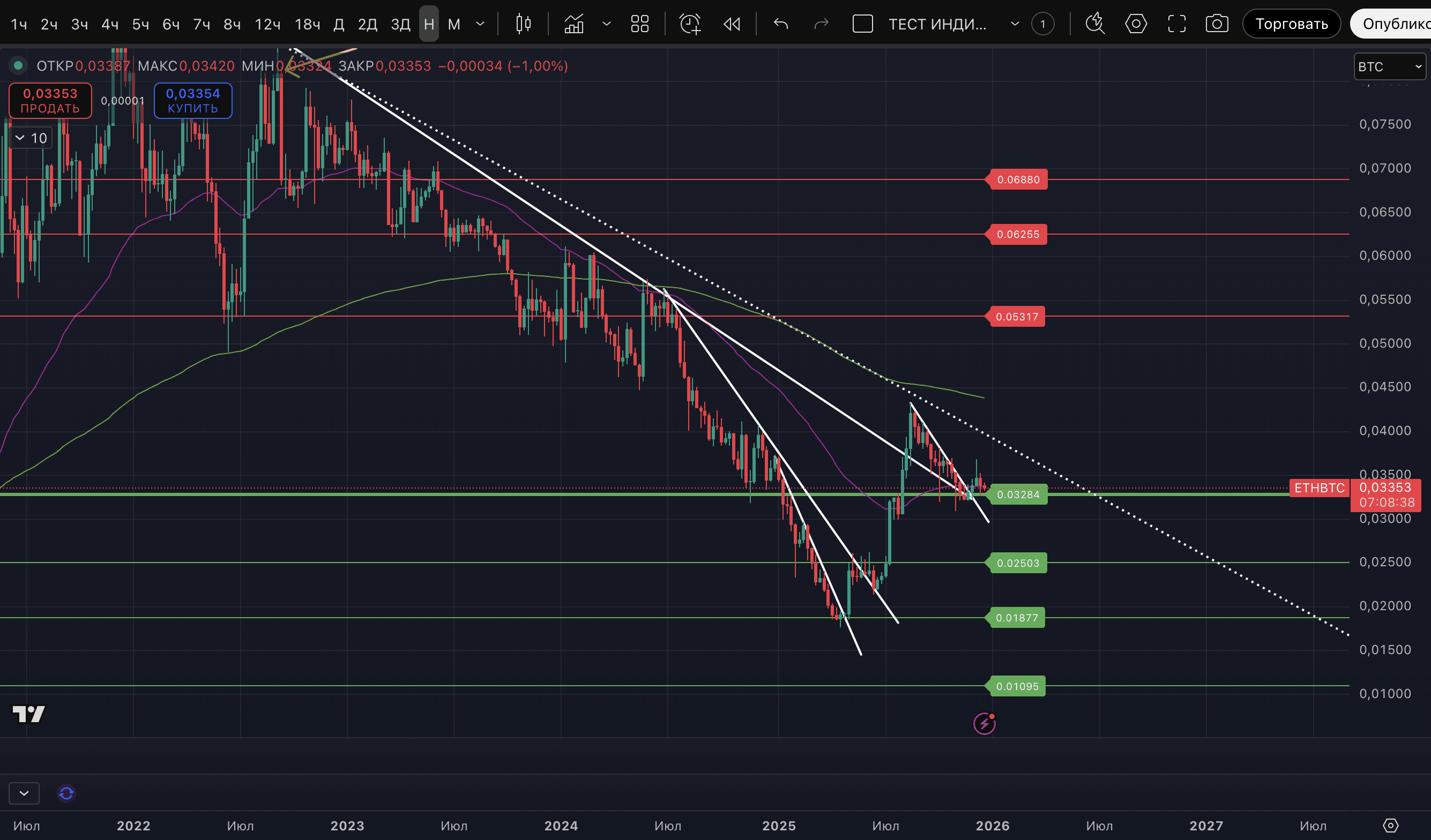 Ciò che non si allinea con le aspettative ribassiste è che nel grafico della coppia ETH/BTC il prezzo sui timeframe superiori (giornaliero, settimanale) ha formato una base per una continuazione della crescita. C'è una tendenza rialzista sul timeframe giornaliero e ci sono etichette di supporto, c'è il test della EMA 200. C'è una tendenza rialzista sul timeframe settimanale e c'è la quarta etichetta aggiuntiva di potenziale supporto, che conferma il tentativo di riportare il grafico a una crescita, dal test della EMA 50 del timeframe settimanale.