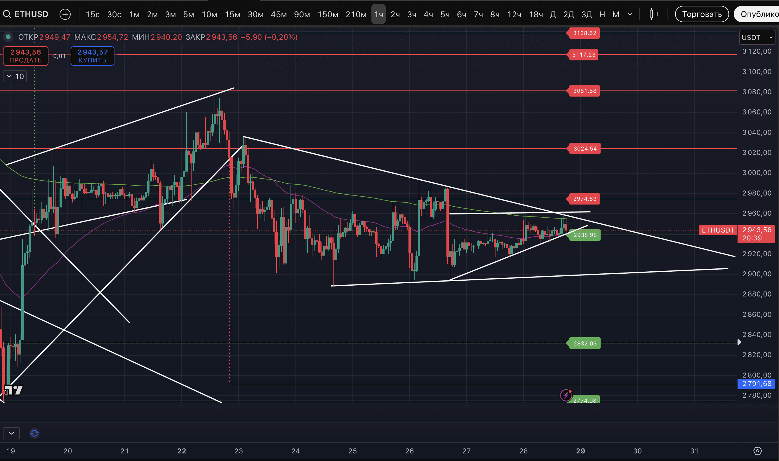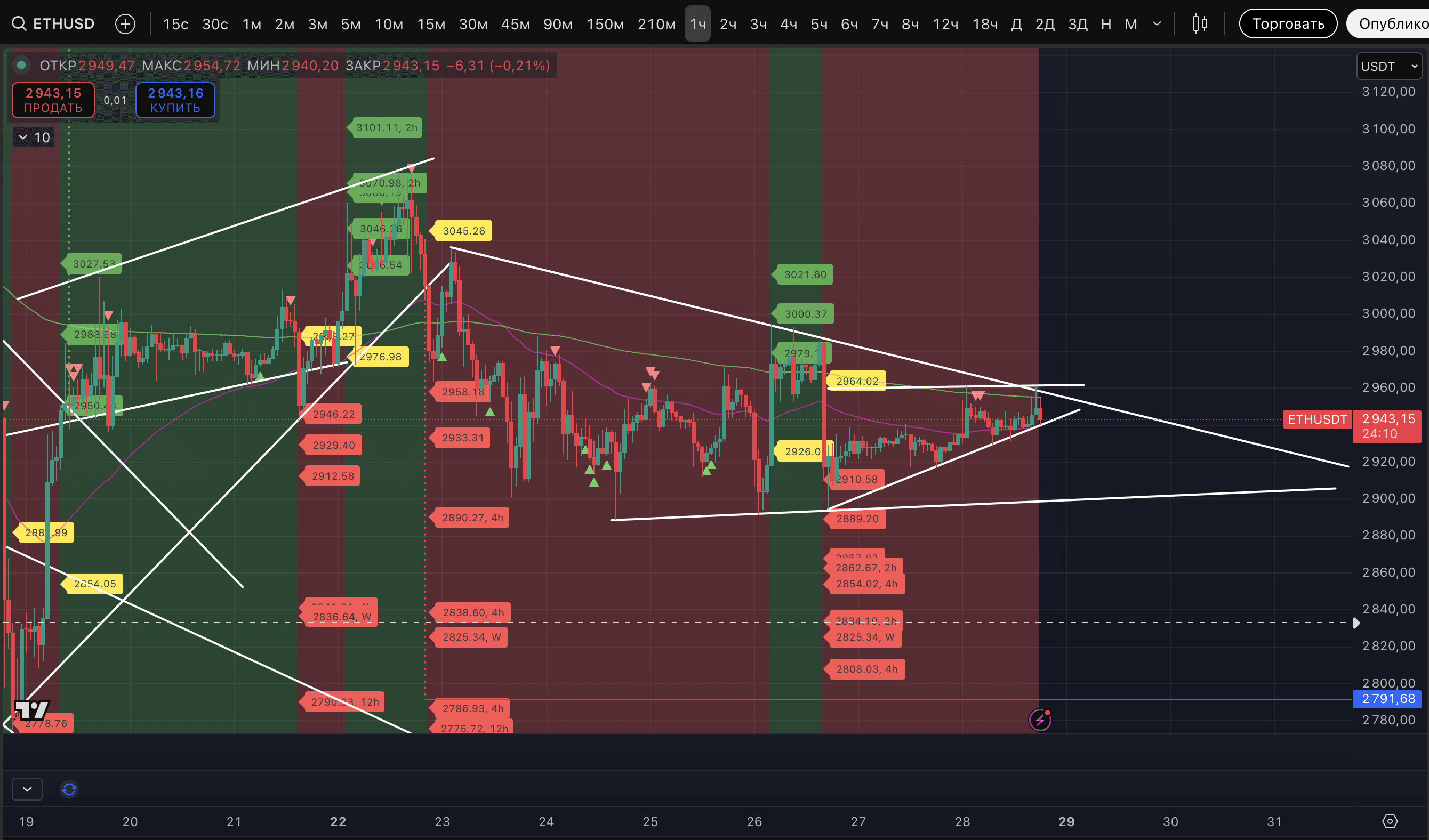 Per quanto riguarda i livelli orizzontali, la situazione rimane la stessa. Qui i livelli determinanti più vicini sono attualmente 2 938$ come supporto e 2 974$ come resistenza. La rottura del supporto a 2 938$ apre la strada verso l'area dei movimenti impulsivi 2832-2 938$. La rottura della resistenza a 2 974$ apre la strada verso il prossimo obiettivo a 3 024$.