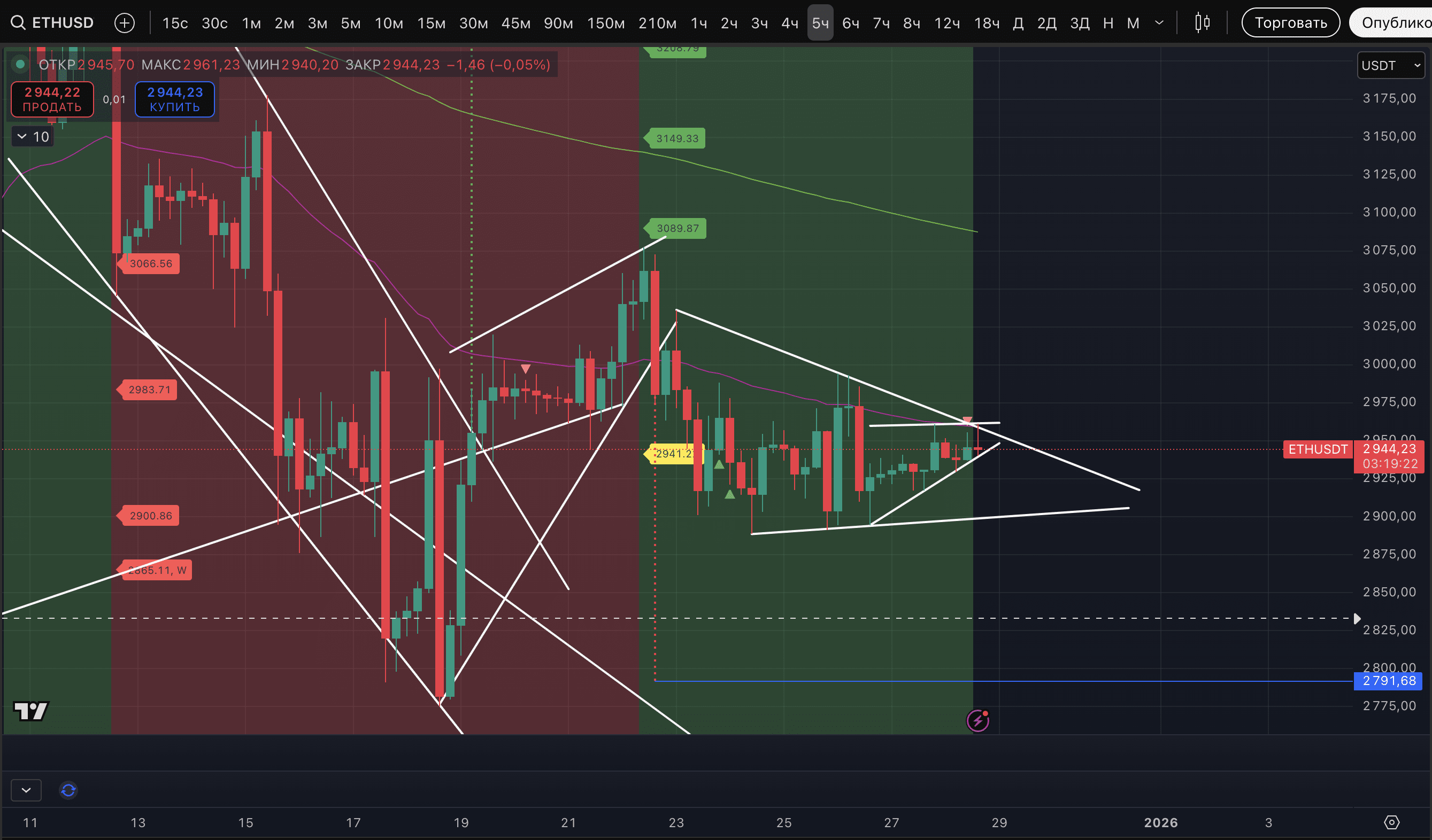 La situazione per ETH al momento appare anch'essa correttiva. Nel suo grafico dalla correzione di venerdì, il prezzo sta rimanendo all'interno di un "Cuneo ribassista", mentre il movimento del prezzo dal 23 dicembre sta ora formando non un modello rialzista ben definito, ma un potenziale "Triangolo".