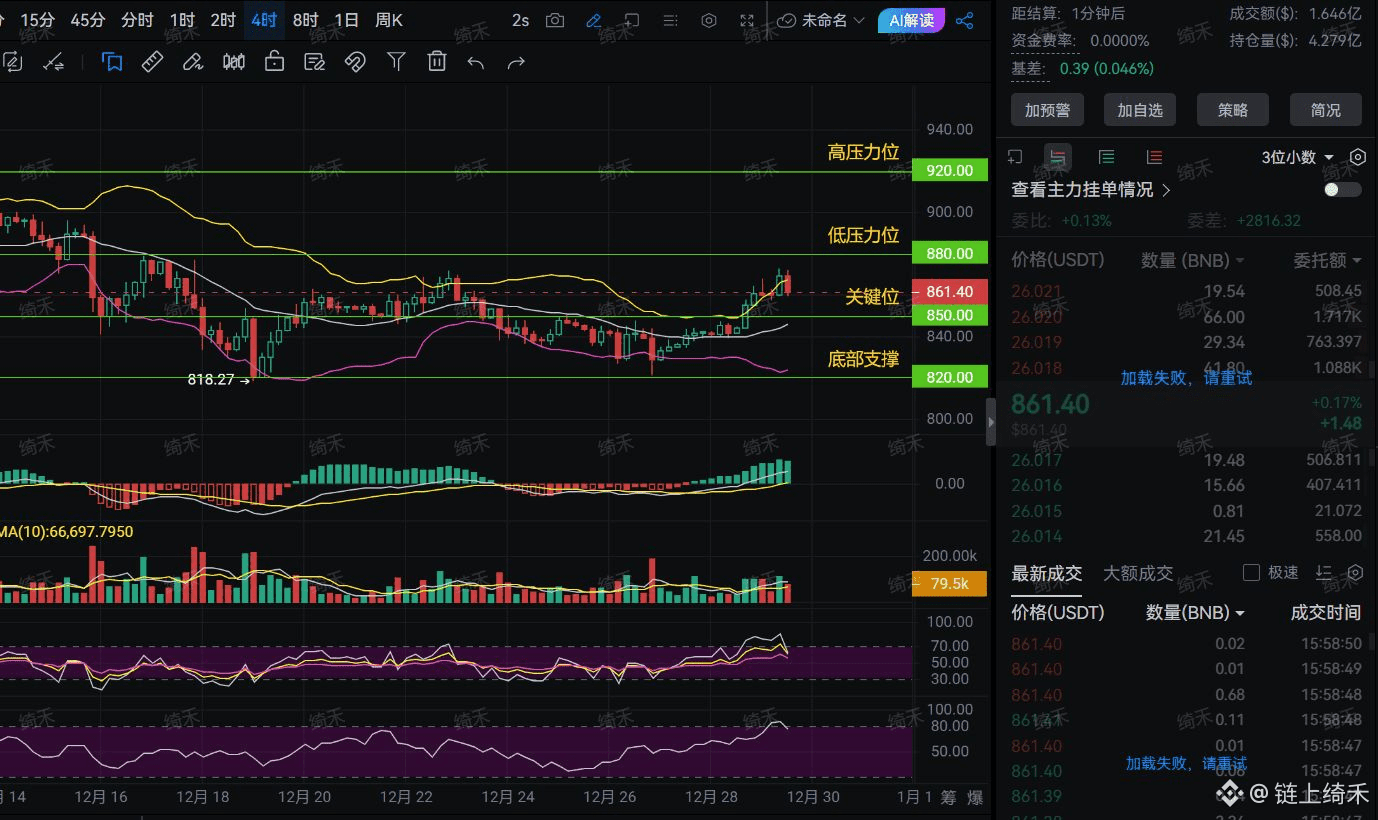 趋势是往上走的,MACD那两条线,已经冲上了0轴,这说明多头开始占优了。但眼下,价格正好卡在861.4这个“关键位”上,往上瞅,第一个大门槛就是880的压力位;往下看,850是关键支撑,再破下去,那可就要考验820的防线了。