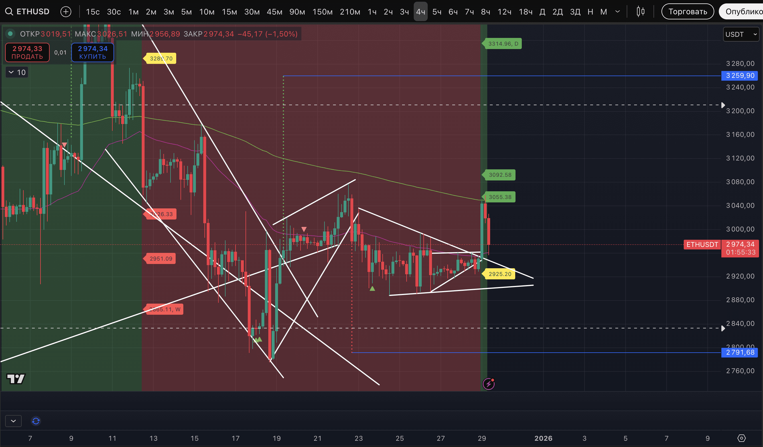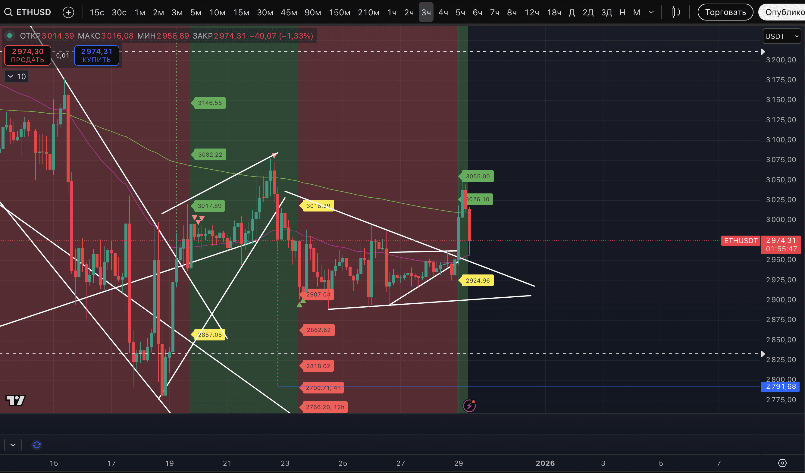 Per ETH, abbiamo aumentato la nostra posizione long durante questo rialzo e il livello medio di ingresso ora è di 3 002,66$. Nella transazione ora ci sono 2/3 del volume. Il prezzo di ingresso è diventato leggermente meno vantaggioso, ma c'è maggiore fiducia nello scenario di crescita.